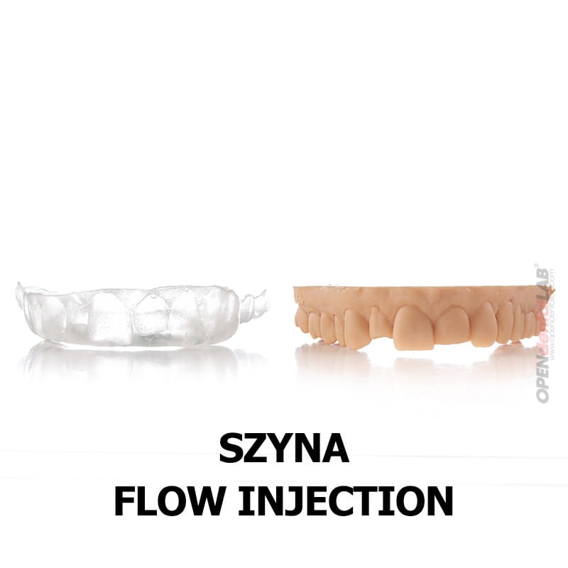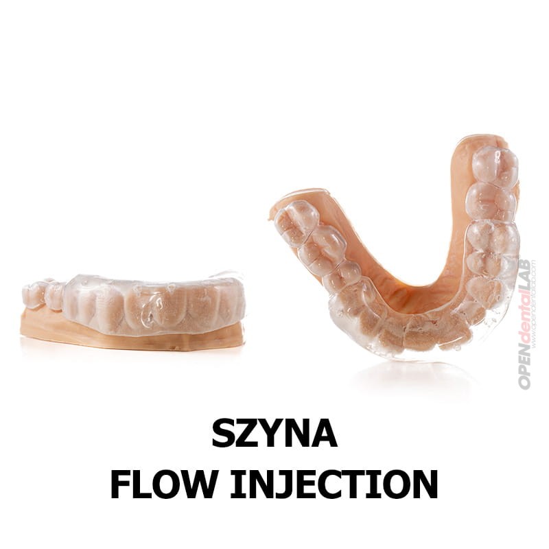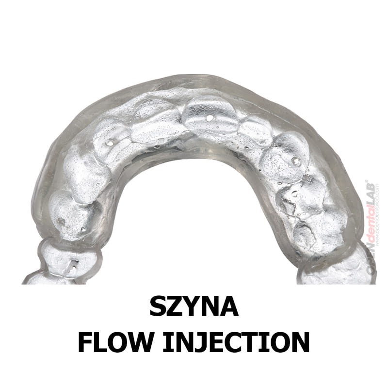 Miękka matryca silikonowa otoczoną twardą szyną Duran o grubości 1.5 mm. Służy do wykonania kompozytowych licówek i koron techniką iniekcyjną po wcześniejszej akceptacji wax-upu cyfrowego. Sztywna część szyny stabilnie opiera się na zębach nieobjętych nadbudową. Transparentny poliwinylosiloksan bardzo dokładnie odwzorowuje zaprojektowaną anatomię zębów, a dzięki wykonanym w szynie kanałom do wprowadzenia strzykawki z płynnym kompozytem, nadbudowa przebiega w sposób prosty. Materiały wykorzystane do wytworzenia szyny doskonale sprawdzają się w pracy z materiałami światłoutwardzalnymi.